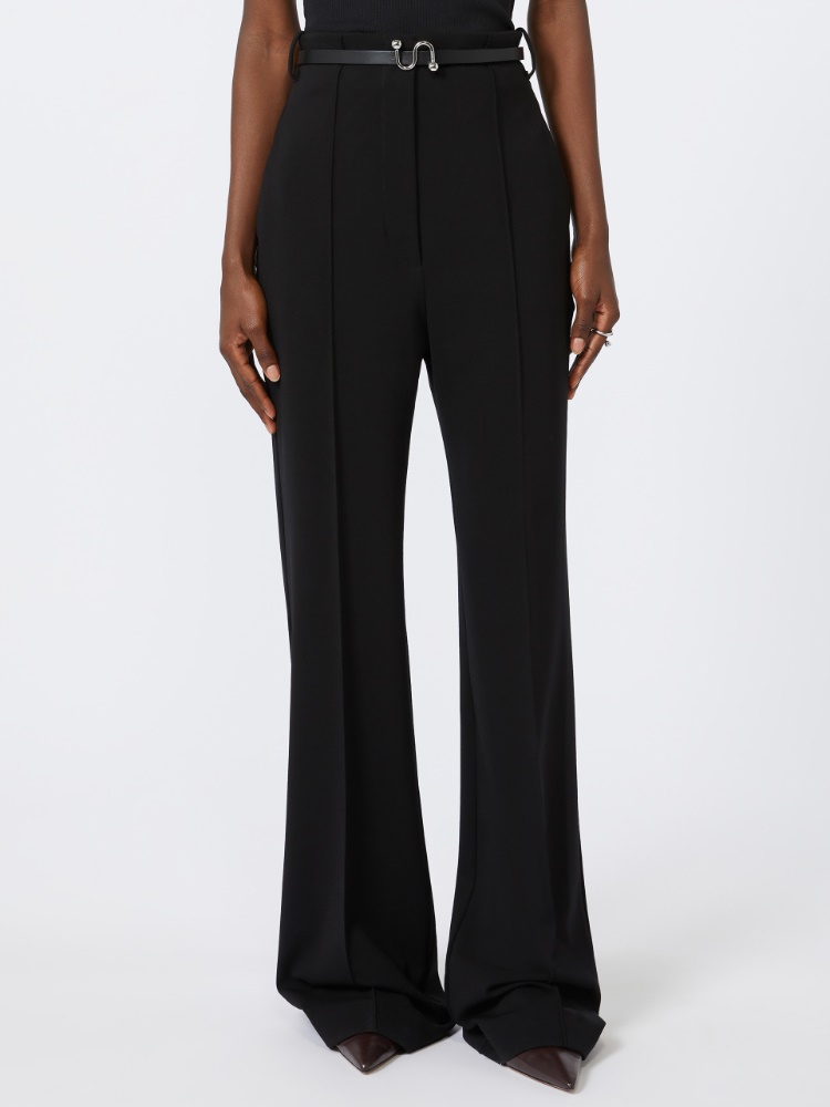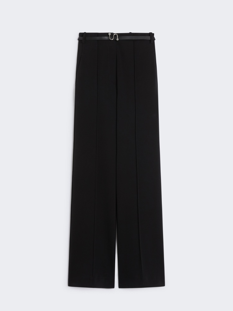Trousers made of soft and comfortable crêpe stitch fabric. The model features a high waist with a fabric belt and S-shaped metal buckle. Ribbing on the front and a trouser pleat on the back.