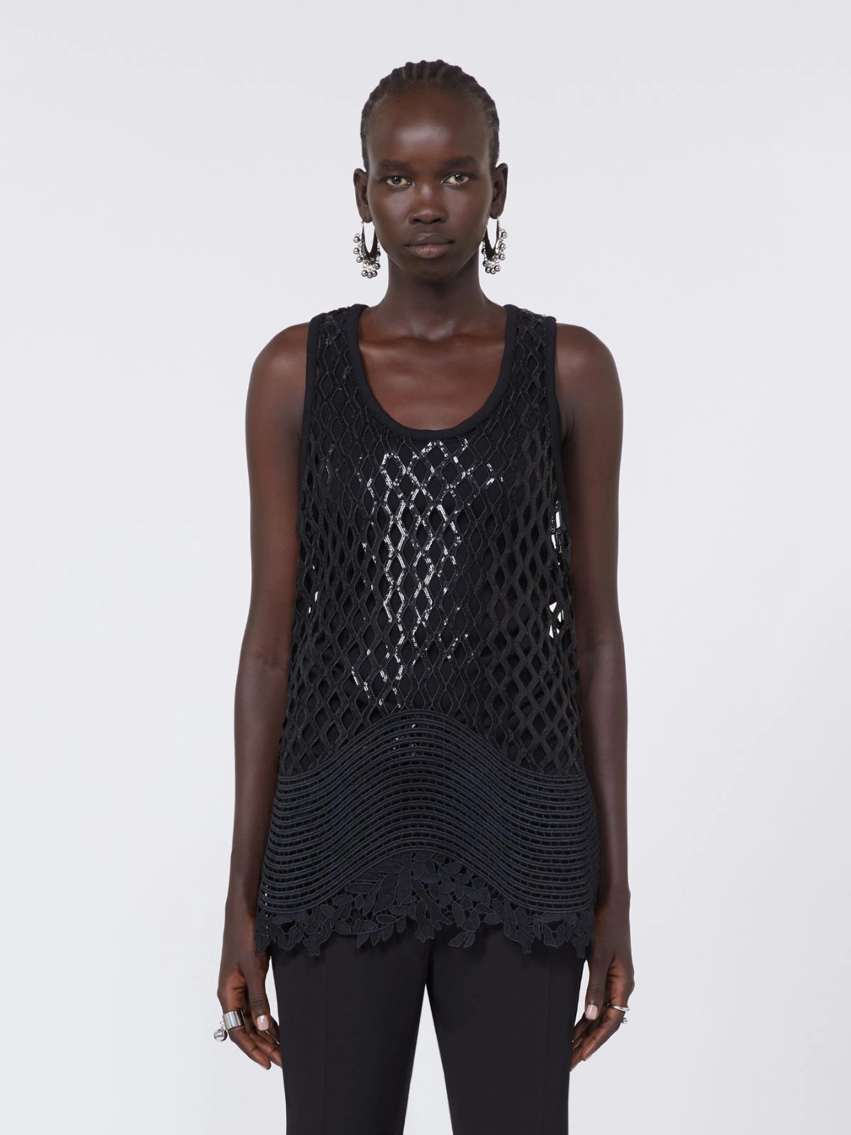 Straight-fit sleeveless top in sequinned mesh fabric. The garment features a racerback line with a rounded front neck, and a matching-tone macramé edge with a scalloped hem that follows the pattern. Lined with a ribbed vest. Side slits.